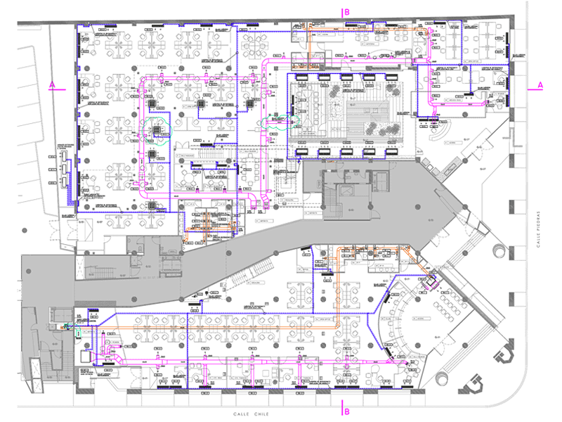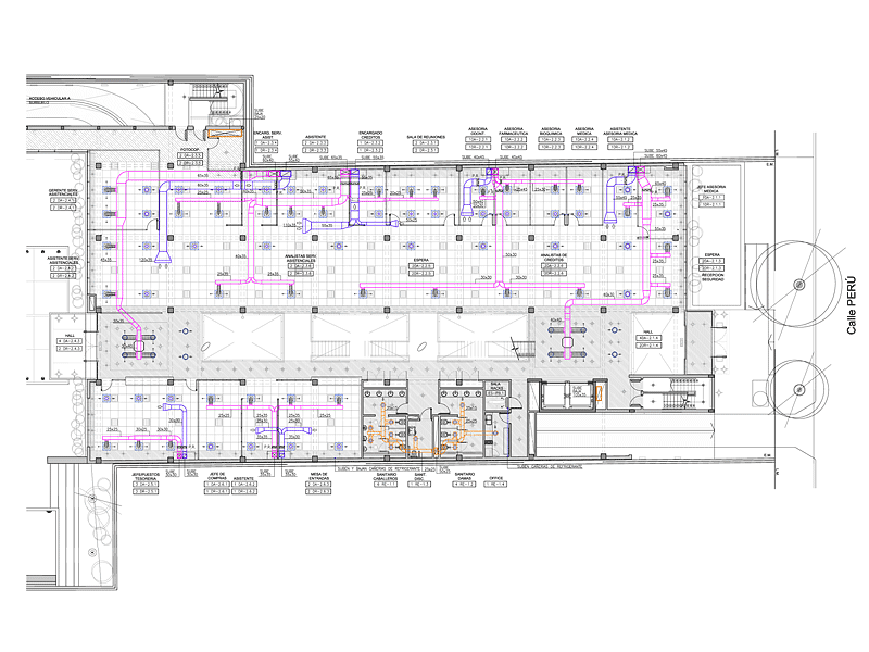 Sistemas de acondicionamiento tipo VRV, frío-calor con calefacción por bomba de calor. La distribución de aire desde las unidades evaporadoras sobre cielorraso realizadas por medio de una red de conductos de alimentación y retorno con difusores terminales. Sistema de Inyección de aire exterior y extracciones mecánicas de locales sanitarios y salas de máquinas. Proyecto y Dirección de Obra.