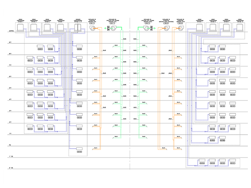 Sistema de aire acondicionado central con equipos autocontenidos del tipo Roof-Top frío-calor. Extracciones mecánicas de cocheras, locales sanitarios y salas de máquinas. Proyecto.