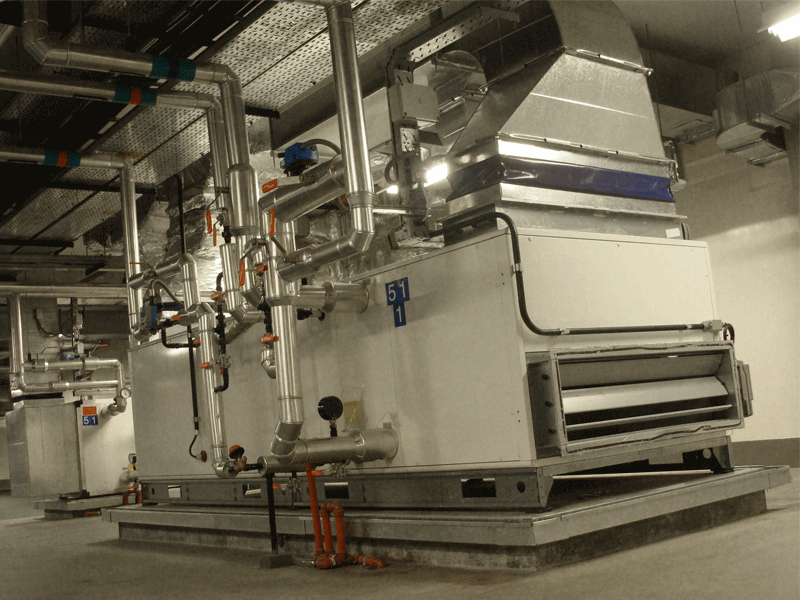 Nuevo Edificio de Radioterapia. La generación de agua enfriada para alimentar las serpentinas de refrigeración de las Unidades Manejadoras de Aire y los equipos Fan-Coils está realizada por medio de dos Máquinas Enfriadoras de agua con condensación por aire. El agua caliente la provee un intercambiador de calor vapor-agua. Manejadoras de Aire con filtrado de Alta eficiencia y 100% aire exterior. Ventilaciones mecánicas complementarias.