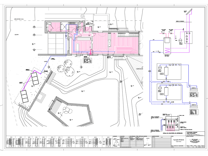 Sistema de agua caliente y radiadores con caldera mural y aire acondicionado con equipos VRV frío-calor. La casa se completa con paneles colectores de energía solar, con bombas, cañerías y tanques de acumulación para precalentamiento del agua caliente sanitaria.